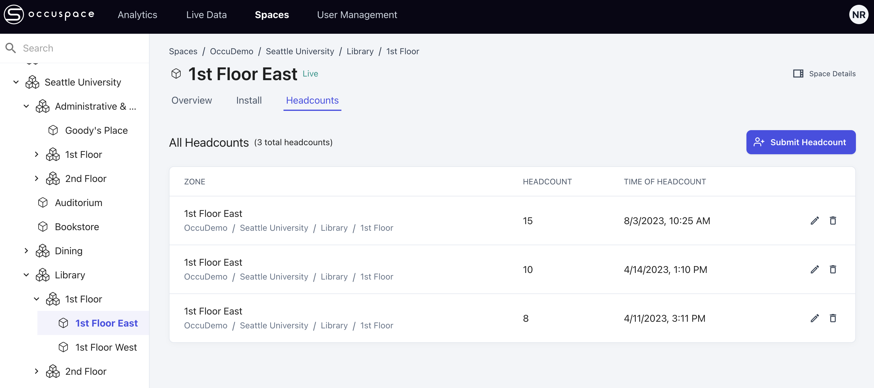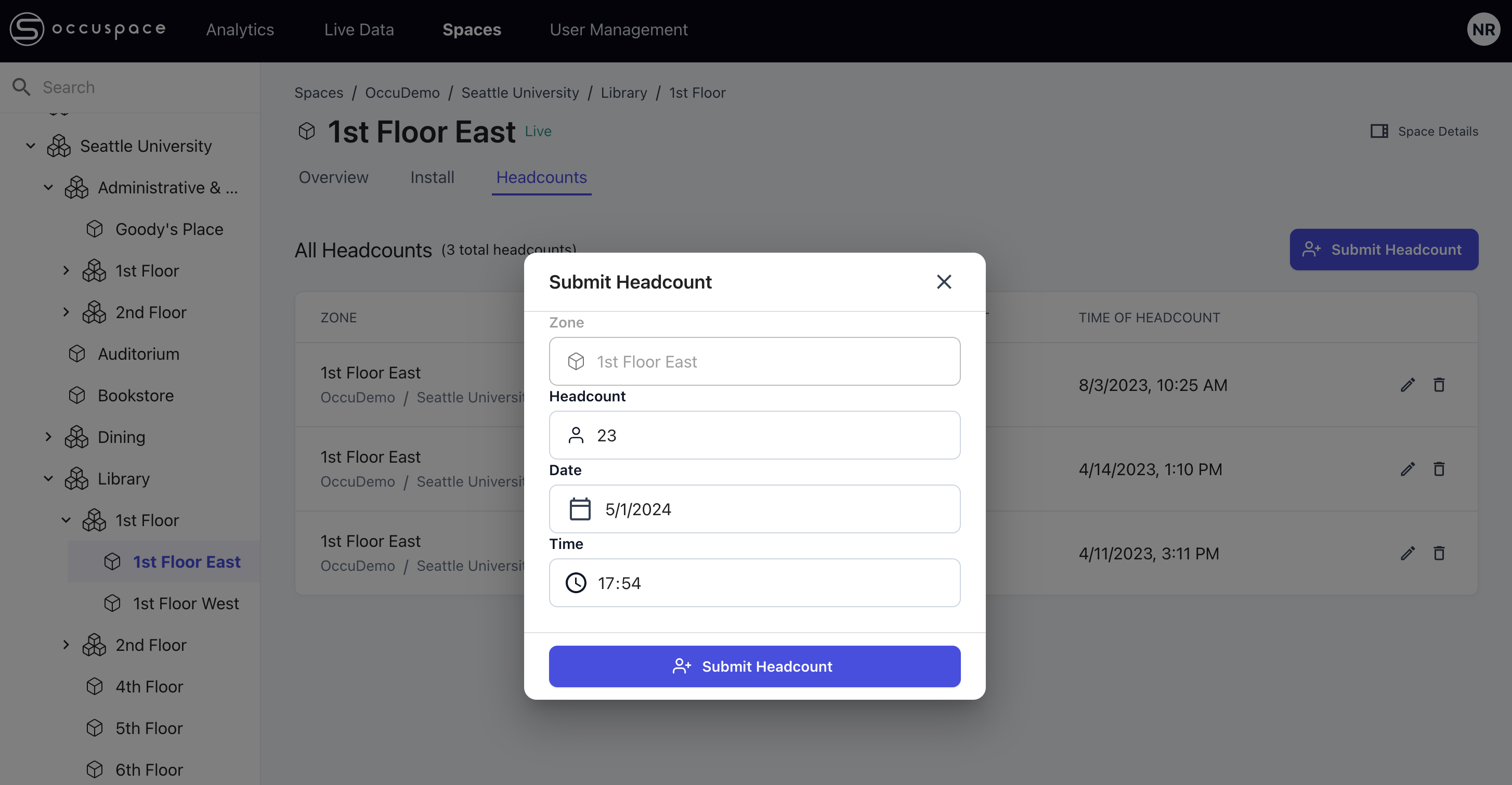 The Occuspace Portal provides all the functionality you need to capture and track head counts for your spaces.  This is done on the "Head Counts" tab of the "Spaces" section of the Occuspace Portal.